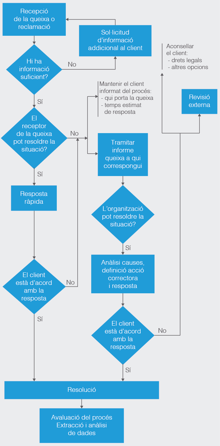 La norma ISO 10002-Sistemes de gestió de queixes i reclamacions defineix el procediment per al tractament de les queixes. El procés de resolució de queixes engloba, per una banda, les accions externes de relació amb el client i, de l’altra, accions internes de control i administració de les queixes, concretament: