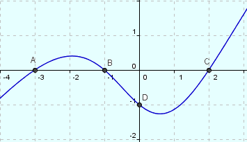 Observa en la gràfica adjunta els punts de talls de la funció amb l'eix d'abscisses: punt A de coordenades (-3,0), punt B de coordenades (-1,0) i punt C de coordenades (2,0). El punt D de coordenades (0,-1) és el punt de tall de la funció amb l'eix d'ordenades.