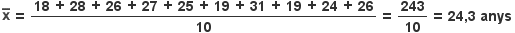 on hem usat el símbol ∑ per indicar sumes, concretament, ∑xi vol dir la suma Així és com es calcularia la mitjana si ens donen una sèrie estadística curta o llarga sense cap valor repetit, o amb pocs valors repetits. Per exemple, si ens diuen que les edats d'un equip de basquet són 18, 28, 26, 27, 25, 19, 31, 19, 24 i 26 anys i ens demanen calcular la mitjana, faríem: