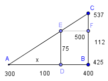 Els triangles ABC i ADE són semblants i apliquem la proporcionalitat entre els costats homòlegs: