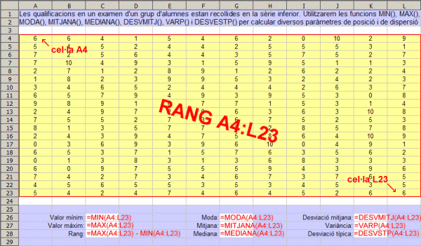 i que us demanessin calcular diverses mesures estadístiques com la moda, la mitjana, la mediana, la desviació mitjana, la variància i la desviació típica. La feinada seria impresionant si haguéssiu de fer-ho a mà (o amb l'ajuda d'una calculadora de mà com a molt). Recordeu que hauríeu de començar per fer la taula de freqüències (comptabilitzant tots els alumnes que tenen un 0, tots els que tenen un 1, tots els que tenen un 2, etc ... ), afegir columnes amb les freqüències acumulades i altres columnes amb productes per calcular la mitjana, la variància , .. etc. El full de càlcul permet calcular cadascuna d'aquestes mesures estadístiques escrivint una sola ordre en una cel·la. Evidentment, s'ha de començar per escriure les dades, les notes en el nostre cas, en un determinat rang del full de càlcul (recordeu que un rang en un full de càlcul és un conjunt rectangular de cel·les); un cop fet això, les ordres que s'han d'escriure són: