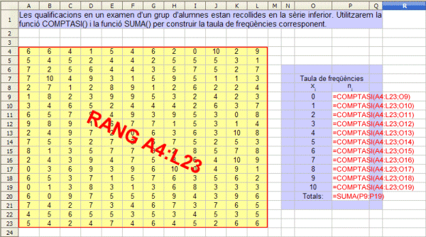 Recordeu que passar unes dades estadístiques de brut a net consisteix en fer una taula de freqüències a partir d'una sèrie estadística. Per exemple, amb la mateixa sèrie estadística de les qualificacions en un examen de l'apartat anterior, hem de comptabilitzar tots els alumnes que tenen un 0, tots els que tenen un 1, tots els que tenen un 2, etc ... El full de càlcul permet calcular les freqüències absolutes usant l'ordre comptasi(). Com en el cas anterior, s'ha de començar per escriure les dades en un determinat rang del full de càlcul (un conjunt rectangular de cel·les); un cop fet això, l'ordre que s'ha d'escriure és: COMPTASI(rang;valor) on: