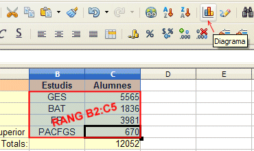 A la cel·la C6 és millor posar la fórmula =SUMA(C2:C5) perquè el full de càlcul ens calculi sempre el total (siguin quins siguin els nombres d'alumnes). Construcció d'un diagrama de barres verticals (columnes) Seleccionem el rang B2:C5 i cliquem sobre el botó de l'Assistent de diagrames