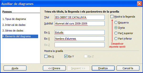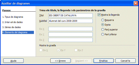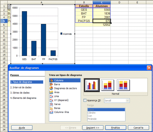 on pots observar que hi surt el diagrama de barres en columna que volem obtenir i un quadre de diàleg anomenat Auxiliar de diagrames. Surt un diagrama de barres en columna ja fet perquè és el primer tipus de diagrama que fa el full de càlcul, però podríem escollir un altre tipus de diagrama de la llista central (després farem un diagrama de sectors). Si observes el diagrama de barres, veuràs que a l'eix X apareixen els diferents estudis que es cursen a l'IOC i a l'eix Y està dividit en intervals d'amplitud 1000, amplitud que ha fet el propi full de càlcul, però que es pot modificar. Com que aquest gràfic ja és del tipus que volem, cliquem sobre el botó Següent dues vegades (ja que no hem de modificar res dels passos Interval de dades ni de Sèrie de dades) fins a arribar al Elements del diagrama. Ompliu els camps Títol, Subtítol, Eix X i Eix Y tal com s'indica a la imatge següent i desactiveu l'opció Mostra la llegenda: