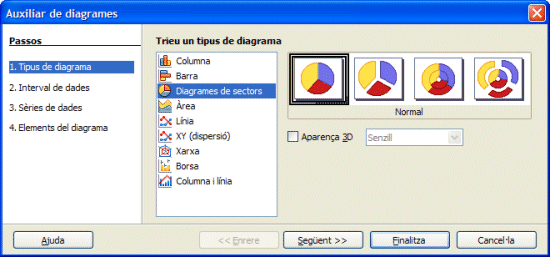 Podeu escollir un altre diagrama al quadre de diàleg Auxiliar de diagrames i veure el resultat, nosaltres veurem ara com podem obtenir un diagrama de sectors. Com en el cas anterior, seleccionem el rang B2:C5 i cliquem sobre el botó de l'Assistent de diagrames