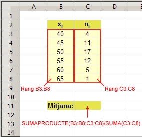 El full de càlcul Calc tè les ordres SUMA() per obtenir el denominador ∑ni i SUMAPRODUCTE() per obtenir el numerador ∑xi·ni . Explicarem com s'utilitzen les ordres SUMAPRODUCTE() i SUMA() per calcular una mitjana a partir d'una taula de freqüències amb un exemple (i sense afegir cap columna!). Suposem que volem calcular la mitjana dels valors xi i de les seves freqüències absolutes ni de la taula següent. |