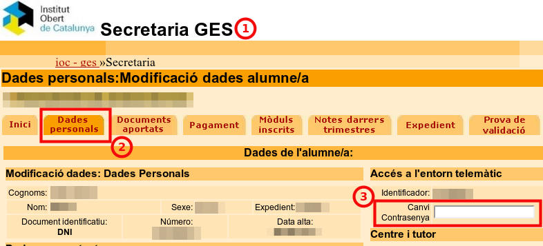 2: Des de Secretaria GES, pestanya Dades personals, escriviu la nova contrasenya i cliqueu el botó Processar del capdavall de la pàgina. Trobareu més informació en el tutorial Com canviar la contrasenya asignada pel campus IOC.