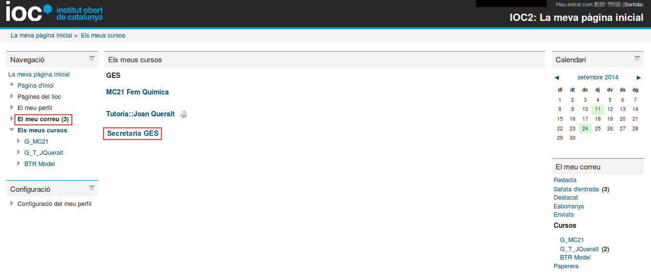 Un cop us hagueu identificat al campus IOC amb el vostre nom d’usuari i contrasenya entrareu a La meva pàgina inicial del campus. Des d’aquí podreu accedir a tots els racons del campus als que teniu accés.