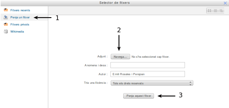 - Després fent clic al botó Sel·lecciona fitxer o bé Navega (número 2) podreu navegar pel vostre ordinador fins a trobar l’arxiu que voleu penjar.