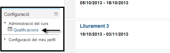 Per veure les vostres qualificacions només heu d’entrar a la matèria de la qual vulgueu consultar les qualificacions, i a anar al bloc Configuració, a la columna esquerra. Recordeu que si el teniu minimitzat només cal que hi passeu el punter del ratolí per sobre per veure-ho. Allà hi trobareu l’Administració del curs, feu clic i veureu l’element anomenat “Qualificacions”.