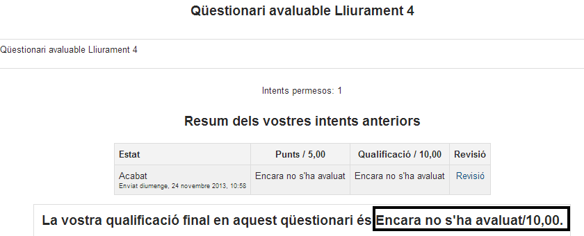 Però hi ha alguns qüestionaris que contenen preguntes obertes, on cadascú dóna la seva pròpia resposta, i que han de ser corregides pel professorat. En aquest tipus de qüestionari quan s’han acabat de fer no podreu veure la puntuació obtinguda fins que el professorat no faci la correcció. Veureu una cosa semblant a aquesta: