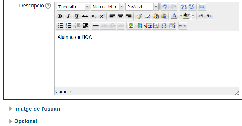 La primera vegada que entreu al campus IOC trobareu tot el perfil completat excepte la imatge que us identifica i la descripció. És important que quan comenceu a treballar al campus hàgiu completat el vostre perfil personal.