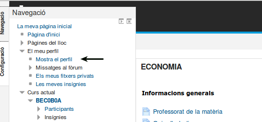 Per entrar al vostre perfil ho podeu fer des de qualsevol curs del campus. Hi ha diferents vies, una és clicant sobre el vostre nom un cop hagueu entrat identificats. Però també des de la part esquerra, a la pestanya Navegació, hi trobareu una opció anomenada El meu perfil, seleccionant Mostra perfil podreu entrar-hi i visualitzar-lo.