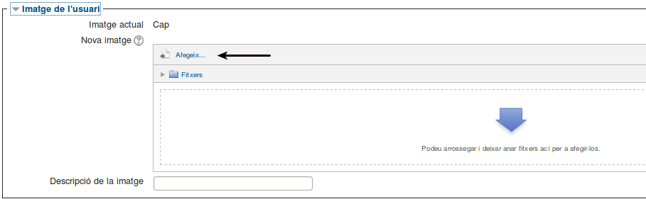 A l’espai Imatge de l’usuari és on penjareu la foto que us identificarà. Podeu penjar la foto arrossegant-la fins a l’espai que diu: Podeu arrossegar i deixar anar fitxers ací per afegir-los, però també podeu seguir aquest altre camí: Premeu Afegeix