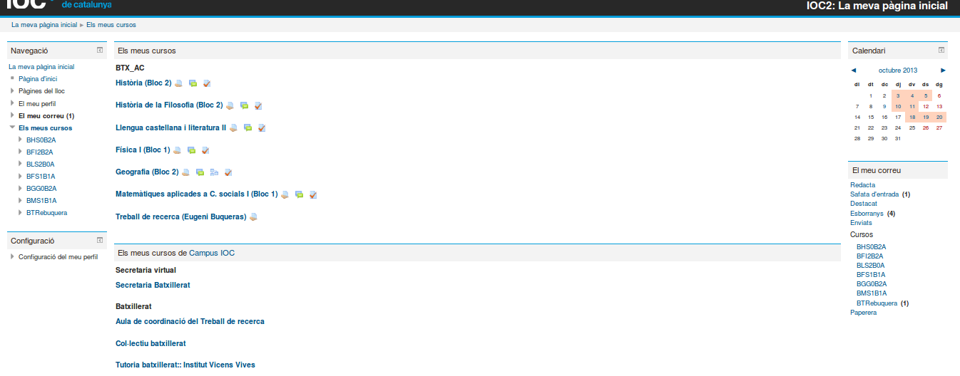 Un cop us hagueu identificat al campus IOC amb el vostre nom d’usuari i contrasenya entrareu a La meva pàgina inicial del campus. Des d’aquí podreu accedir a tots els racons del campus als que teniu accés.