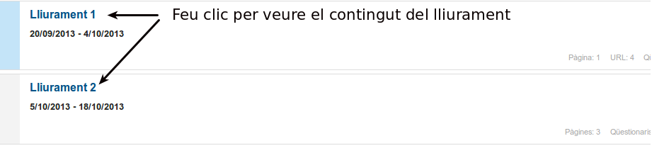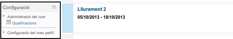 Hi ha 5 seccions inferiors al bloc central que corresponen als 5 lliuraments de què es compon un semestre. Per entrar en un lliurament només cal fer clic sobre el seu nom per veure els materials d’estudi i les activitats de cada lliurament.