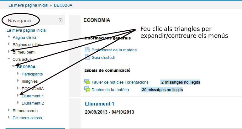 Dins dels cursos —si feu clic al triangle davant del nom— podeu moure us pels lliuraments i les seccions: