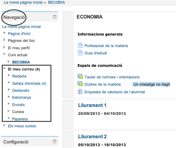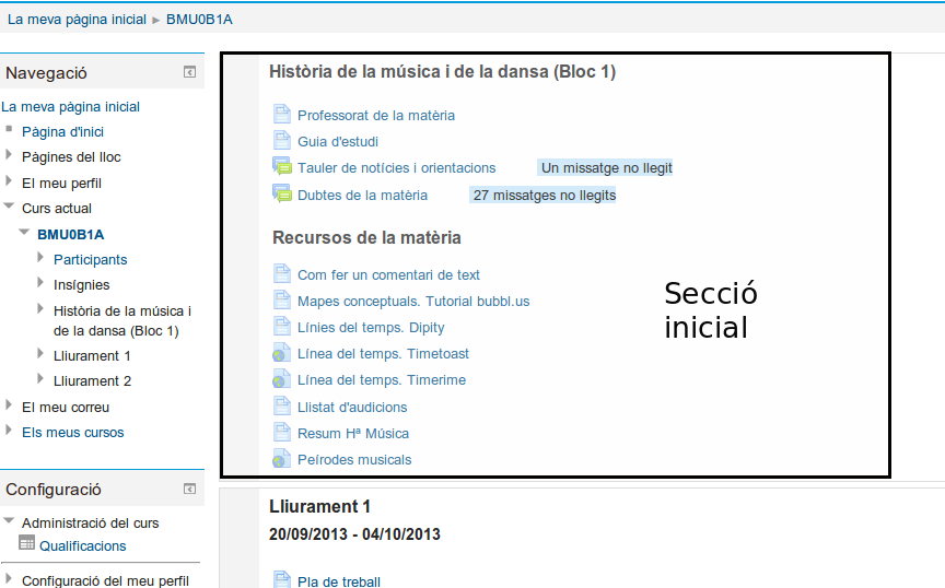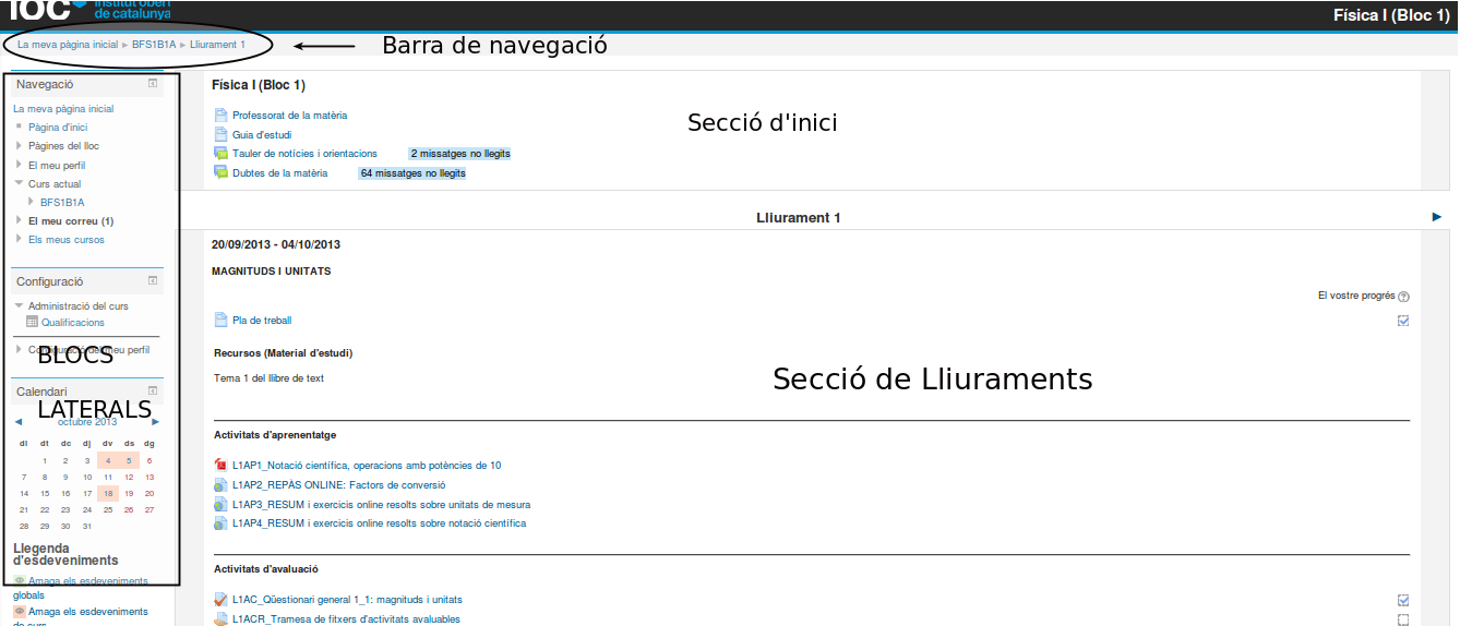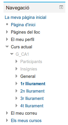 Podeu veure a la part superior la Barra de navegació, a la part esquerra els blocs i a la part central el curs, amb una secció fixa d’inici i una secció per cada Lliurament amb les dates d’inici i tancament.