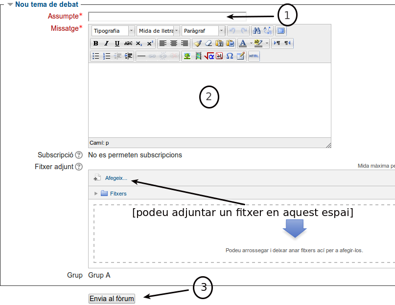 Finalment, envieu el dubte prement el botó Envia al fòrum (número 3).