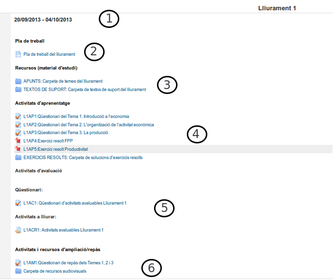 Les seccions inferiors del bloc central estan dividides en 5 temes que corresponen als 5 lliuraments de què es compon un semestre.