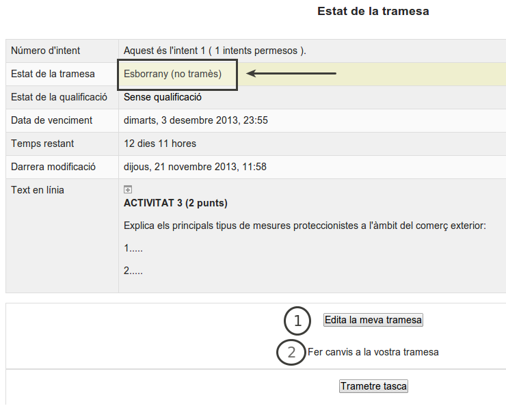 - Tocar el botó Edita la meva tramesa ens permet tornar a escriure la nostra feina (pas 1).