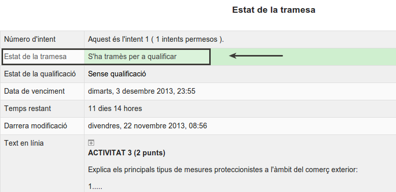 Sota de l’enunciat de cada tasca tens informació respecte de l’estat de la teva tramesa i de la qualificació obtinguda (en el cas que l’hagis enviada).