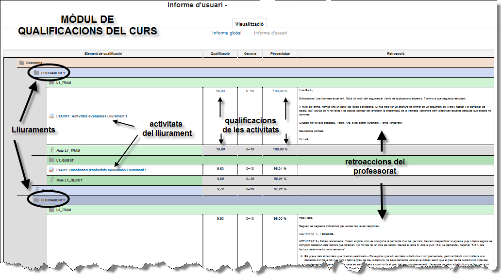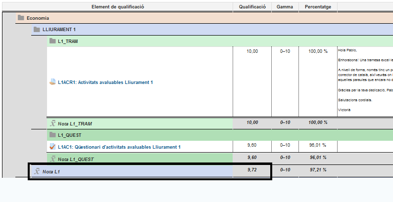 Cada Lliurament està format per una sèrie d’activitats que contribueixen a la qualificació Total de la categoria (Nota L1 a l’exemple), que és un número del 0 al 10. Aquest valor us dirà com avança el vostre aprenentatge al llarg dels 5 lliuraments de la matèria: