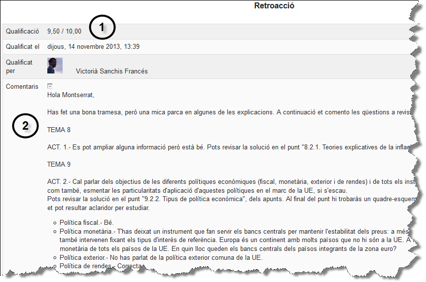 Hi podeu veure la qualificació obtinguda: 9,5 sobre 10 (número 1), els comentaris del professor (número 2) i altres informacions.
