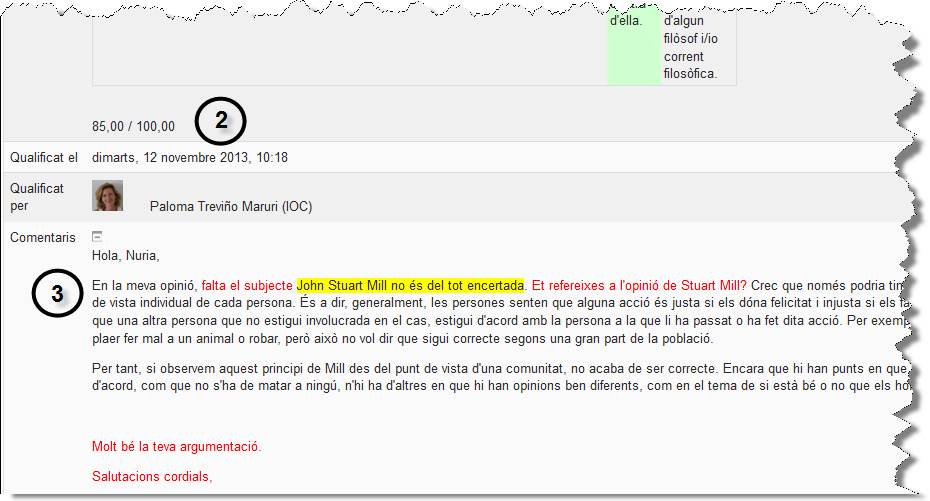 Hi podeu veure amb fons verd la casella de la graella de correcció que us correspon (número 1), la puntuació total obtinguda: 85/100 o 85 punts de 100 punts possibles (número 2) i, finalment, el comentari del professorat (número 3).