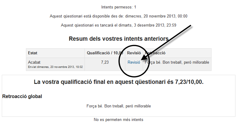 Si feu clic sobre l’enllaç Revisió podreu veure totes les vostres respostes i la correcció de les preguntes automàtiques, però no podreu canviar-les. Quan el professorat hagi corregit les preguntes obertes ja podreu veure la qualificació obtinguda i els comentaris que us hagi pogut fer: