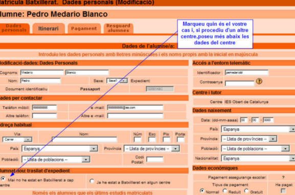 Quan cliqueu en Secretaria Batxillerat, entrareu a l'espai on podreu completar tota la matrícula: |