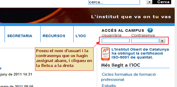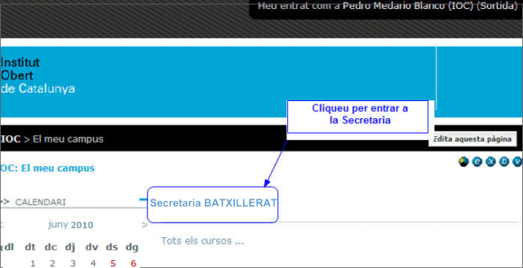 Quan cliqueu en el botó Entrada, el programa comprovarà si heu posat usuari i contrassenya correctes; si ho són, us portarà al campus de l'IOC i allà veureu que teniu accés a un espai de nom Secretaria Batxillerat (feu el que indiquem en el requadre): |