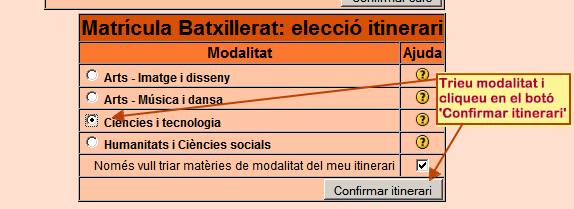 Quan cliqueu el botó Confirmar opcions, veureu les modalitats del batxillerat; heu de triar-ne una, escollir l'idioma i clicar el botó Confirmar itinerari.