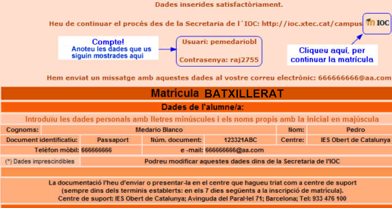 Resultat? Heu generat un nom d'usuari i una contrasenya; ambdues dades són molt importants perquè pugueu estudiar a l'IOC. Per tant, anoteu-les i mantingueu-les en lloc segur. De fet, us seran enviades a l'adreça de correu que hagueu posat. |