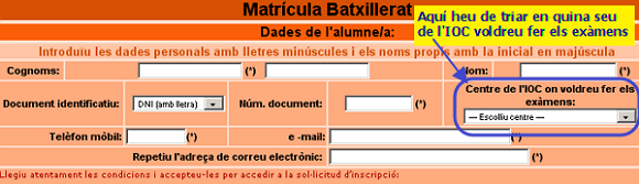Entreu a http://ioc.xtec.cat/secretaria/btx/alta/ i veureu una pantalla com la següent (totes les dades demanades són obligatòries, i si voleu que us sigui assignat un IES col·laborador, no oblideu triar ja el centre; a més, haureu de marcar una casella d'acceptació de condicions i clicar en el botó Acceptar): |