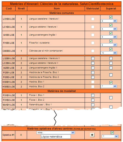 Quan cliqueu el botó Confirmar opcions, veureu les modalitats del batxillerat; heu de triar-ne una i clicar el botó Confirmar itinerari.