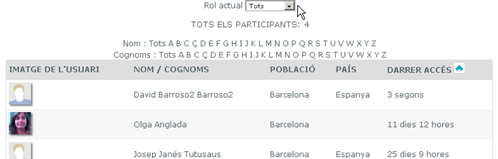 Si volguéssiu obtenir només els professors de l'aula, hauríeu de clicar en "Rol actual" (on indica la fletxa del cursor) i triar el rol professor.   Noteu que estan ordenats per la columna DARRER ACCÉS. Si els voleu veure ordenats per altra columna, cliqueu en la capçalera de columna corresponent (per exemple, clicant en la paraula POBLACIÓ, apareixerien ordenats per població).