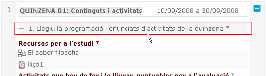 Les activitats quinzenals les marca el professor, o professora, quinzena a quinzena. El professor, però, ha d'iniciar l'espai reservat a cada quinzena oferint a l'alumne la programació i enunciats de les activitatats a fer (observeu la figura):